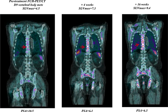 PET/CT progression/non-progression proved capable of predicting outcome in patients with other tumors, including bone metastases [13, 14]. As abiraterone in CRPC is given continuously until progression, it is essential to predict and monitor progression rather than the response to treatment. PET/CT criteria for monitoring tumor progression are simpler and more widely accepted than those for monitoring tumor response. The relationship of PSA kinetics to radiological PFS has been recently evaluated in an exploratory analysis of patients treated with abiraterone in a randomized phase III study [15]. Radiological PFS was positively associated with the magnitude of PSA decline, and the effect remained after correcting for covariates. However, in this trial the PSA level was monitored every 2-3 months, whereas the kinetics of serum PSA analyzed monthly during the first few months of abiraterone is associated with PSA flare in nearly 10% of these patients, which could impair the early evaluation of PSA response [16], The impact of FCH-PET/CT could be even more relevant for CRPC with no reliable serum biomarker, as is the case of bulky metastatic disease with low serum PSA levels. However, in a few of these cases, elevated circulating Chromogranin A levels have been reported as possible expression of a CRPC with neuroendocrine differentiation in which the role of FCH-PET/CT is not known [17, 18]. Thus, the integrated use of PSA and FCH-PET/CT could potentially lead to a significant improvement in outcome prediction and in the therapeutic monitoring of CRPC patients.