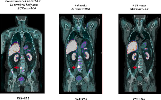 Figure 3: Example of a patient with a rapidly declining PSA level but a week 6 FCH-PET/CT being read as progression in bone lesions. By week 14, this progression improved, indicating that the progression seen at week 6 was due to bone flare.