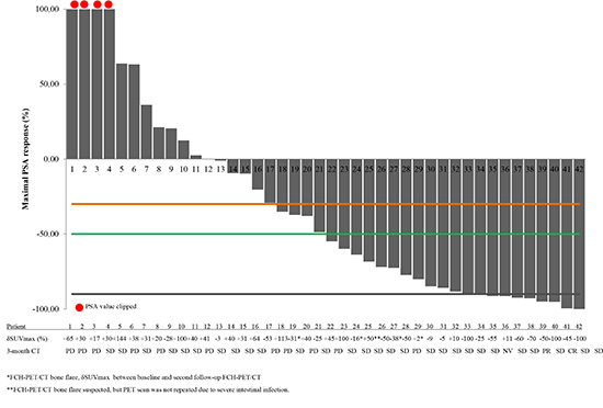 Figure 4 describes waterfall plots of maximal PSA change and correlation with either follow-up FCH-PET/CT and CT scan in 42 evaluable patients.