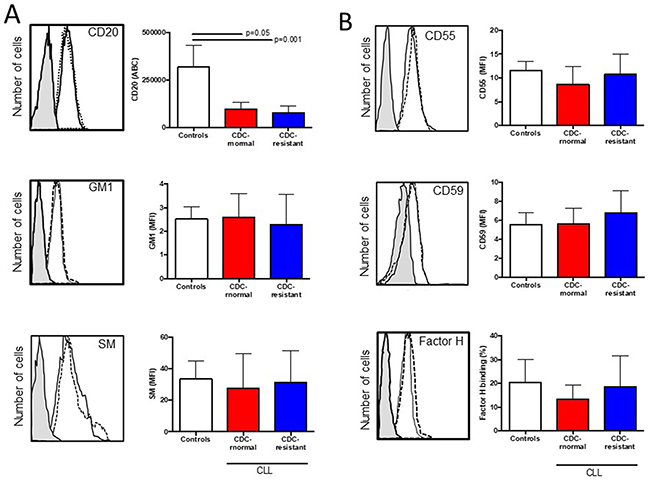 In this study, 5×105 freshly isolated lymphocytes were incubated for 30 minutes at 4°C with saturating concentrations of anti-CD19 mAbs combined with phycoerythrin (PE)-cyanin 7 (PCY7), and another mAb (anti-CD5, anti-CD20, anti-CD59 or anti-CD55) conjugated with fluorescein isothiocyanate (FITC). All mAb, as well as their isotype control mAb were from Beckman Coulter (Villepinte, France), biotinylated lectin SNA, specific to the α2-6 linked SA, and biotinylated lectin MAA specific to the α2-3 linked sialic acid (Vector Burlingame, CA), lysenin recognizing SM (PeptaNova, Sandhausen, Germany) or FITC-conjugated cholera toxin subunit B recognizing GM1 (Sigma-Aldrich). Samples containing biotinylated-lectin were covered for an additional 30 minutes with FITC-conjugated streptavidin (Jackson Immunoresearch Europe Ltd, Suffolk, UK). Cells stained with lysenin were incubated for 30 minutes with a polyclonal rabbit anti-lysenin Ab, and for another 30 minutes with FITC-conjugated anti-rabbit mAb (PeptaNova, Sandhausen, Germany). To study the binding of factor H on CLL cells, 3.105 cells were incubated for one hour at 37°C with normal human serum diluted 1/4 in PBS followed by a 30-minute incubation with FITC-conjugated anti-factor H mAb (Abcam, Paris, France) at 4°C. The cells were then washed with phosphate buffer saline (PBS) and analyzed on FC500 flow cytometer (Beckman Coulter). The calculation of the MFI of all markers required a minimum of 5,000 events.