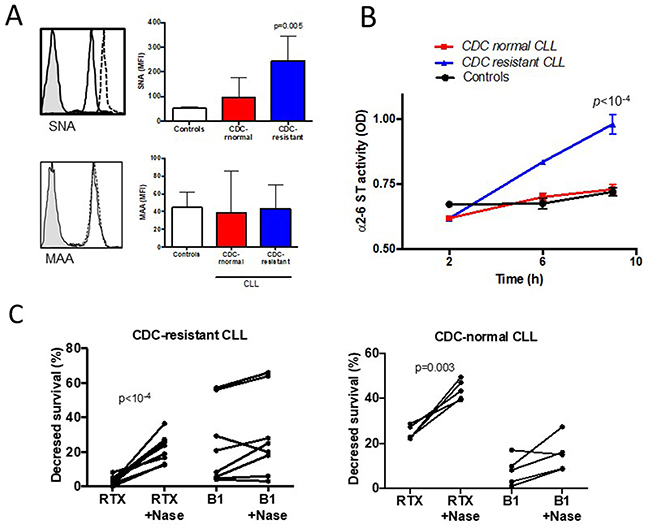 In order to support our hypothesis that resistance to RTX-induced complement activation may have clinical implications, we decided to study in vitro B cell resistance mechanisms to CDC in 69 CLL patients including 34 who would benefit from RTX-chemotherapy. The predictive value of the in vitro CDC-resistance response was independent from the clinical, biological and cytogenetic characteristics of the patients. In contrast, when the CDC results obtained in vitro were compared to the clinical response, an association between CLL resistance to CDC and RTX-chemotherapy response was observed. We further highlighted the important role of CLL α2-6 ST activity and membrane sialylation in determining resistance and susceptibility to CDC.