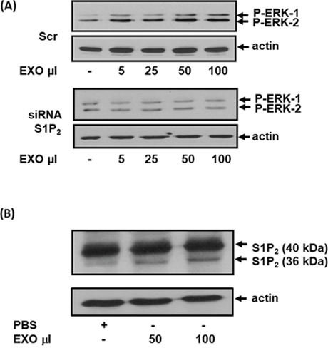 Figure 5: The effect of exosomal S1P2 on ERK-1/2 signaling and S1P2 processing in MEFs. MEFs quiescent for 24 hr were treated for 15 min with exosomes isolated from CM of MDA-MB-231 cells that had been treated with either scrambled siRNA or S1P2 siRNA for 24 h. (A) Western blot showing the effect of exosomes (EXO, μl) from scrambled siRNA (100 nM) and S1P2 siRNA (200 nM)-treated MDA-MB-231 cells on ERK-1/2 activation in MEFs. Blots were probed with anti-phospho ERK-1/2 antibody. (B) Western blot showing the uptake into MEFs of the short S1P2 (Mr = 36 kDa) form from exosomes (EXO, 50 or 100 μl) isolated from MDA-MB-231 cells. Blots were probed with anti-S1P2 antibody. (A, B) Blots were re-probed with anti-actin antibody to ensure equal protein loading. Results are representative of 2-3 independent experiments.