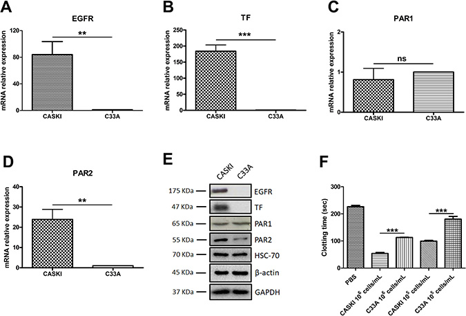 Figure 1: Expression of EGFR, TF, PAR1 and PAR2 in cervical cancer cell lines. Total RNA was extracted, and mRNA was converted into cDNA. Gene expression assays for (A) EGFR (n = 4), (B) TF (F3 gene; n = 3), (C) PAR1 (F2R gene; n = 4) and (D) PAR2 (F2RL1 gene; n = 4) were performed by quantitative PCR. GAPDH was used as a reference gene for normalization. The relative expression level of mRNA was calculated using the ΔΔCT method. Values represent mean + SD; ns: not significant, **P < 0.01, ***P < 0.001 (two-tailed unpaired t test). (E) Cells were lysed, and the protein levels of EGFR, TF, PAR1 and PAR2 were determined by Western blotting. HSC70, GAPDH and β-actin were used as loading controls. Representative image from three experiments. (F) Clotting time of platelet-poor plasma incubated with cells (ranging from 1 × 105 cells/mL to 1 × 106 cells/mL). The reaction was initiated with CaCl2, and the control group (PBS) was evaluated without cells. Values represent mean + SD of four independent experiments; **P < 0.01, ***P < 0.001 (one-way ANOVA).