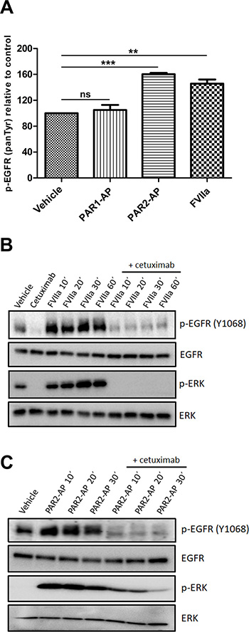 Figure 2: PAR2 transactivates the EGFR-ERK signaling pathway in CASKI cells. (A) CASKI cells were starved for 16 h followed by stimulation with PAR1-AP (50 μM), PAR2-AP (50 μM) or FVIIa (20 nM) for 15 minutes. After cell lysis, equal amounts of protein were used for the determination of p-EGFR using the PathScan Phospho-EGF Receptor (panTyr) Sandwich ELISA Kit. Values represent mean + SD of three independent experiments; ns: not significant, **P < 0.01, ***P < 0.001 (one-way ANOVA). (B and C) CASKI cells were starved in serum-free medium for 16 h, followed by treatment with cetuximab (100 μg/mL). One hour later, cells were stimulated with FVIIa (20 nM) or PAR2-AP (50 μM) for 10 to 60 minutes. After the incubation time, cells were lysed, and the levels of p-EGFR (Tyr 1068), EGFR, p-ERK 1/2 (Thr202/ Tyr204) and ERK were determined by Western blotting. Representative image from three experiments.