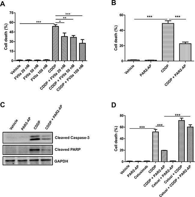 Figure 3: PAR2 activation protects CASKI cells against cisplatin-induced apoptosis through an EGFR-dependent mechanism. CASKI cells were starved in serum-free medium for 4 h, followed by treatment with cetuximab (100 μg/mL) when indicated. One hour later, cells were stimulated with FVIIa (20 nM, 50 nM or 100 nM) or PAR2-AP (50 μM) for 60 minutes. Next, cells were treated with cisplatin (CDDP, 20 μM) for 48 h. (A) FVIIa-mediated chemoresistance was evaluated by propidium iodide staining, followed by flow cytometry. Cells with fragmented DNA (sub-G1 peak) were considered apoptotic cells. Values represent mean + SD of three independent experiments; *P < 0.05, **P < 0.01, ***P < 0.001 (one-way ANOVA). (B) PAR2-AP-mediated chemoresistance was evaluated by propidium iodide staining, followed by flow cytometry. Values represent mean + SD of six independent experiments; ***P < 0.001 (one-way ANOVA). (C) PAR2-AP-mediated chemoresistance was also evaluated by western blot for cleaved caspase-3 and cleaved PARP. GAPDH was used as a loading control. Representative image from three experiments. (D) Cetuximab reversed the resistance to cisplatin promoted by the PAR2 activation. Apoptosis was evaluated by propidium iodide staining, followed by flow cytometry. Values represent mean + SD of three independent experiments; ***P < 0.001 (one-way ANOVA).