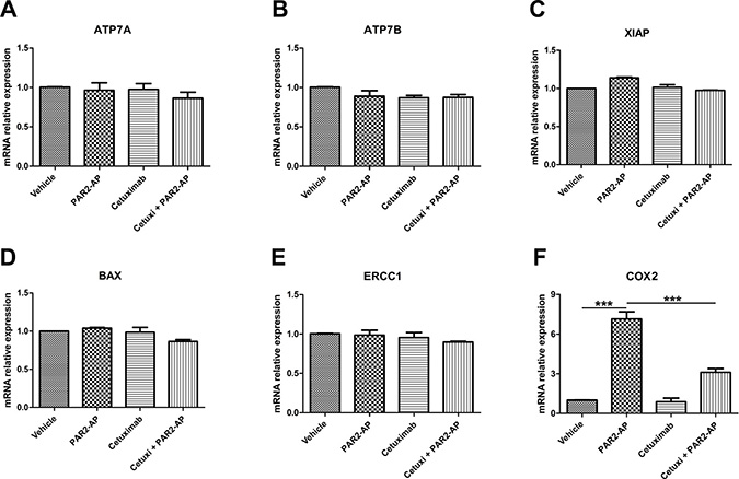 Figure 4: PAR2 activation upregulates cyclooxygenase-2 (COX2) expression through an EGFR-dependent mechanism in CASKI cells. Cells were starved for 16 h and were treated with cetuximab (100 μg/mL). One hour later, cells were stimulated with PAR2-AP (50 μM). After 1.5 h, total RNA was extracted, and mRNA was converted into cDNA. The expression of 6 genes involved in the resistance to cisplatin was performed by qPCR: (A) ATP7A, (B) ATP7B, (C) XIAP, (D) BAX, (E) ERCC1 and (F) COX2 (PTGS2 gene). GAPDH was used as a reference gene. The relative expression level of mRNA was calculated using the ΔΔCT method. Values represent mean + SD of four independent experiments; ***P < 0.001 (one-way ANOVA).