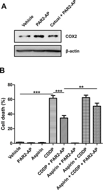 Figure 5: COX inhibition by aspirin impairs chemoresistance promoted by PAR2 activation in CASKI cells. (A) Cells were starved for 16 h and were treated with cetuximab (100 μg/mL). One hour later, cells were stimulated with PAR2-AP (50 μM). After 3 h, cells were lysed, and the levels of COX2 and β-actin (loading control) were determined by Western blotting (representative image from three experiments). (B) CASKI cells were starved in serum-free medium for 4 h, followed by treatment with aspirin (1 mM). One hour later, cells were stimulated with PAR2-AP (50 μM) for 60 minutes. Next, cells were treated with cisplatin (CDDP, 20 μM) for 48 h. Apoptosis was evaluated by propidium iodide staining followed by flow cytometry. Cells with fragmented DNA (sub-G1 peak) were considered apoptotic cells. Values represent mean + SD of four independent experiments; **P < 0.01, ***P < 0.001 (one-way ANOVA).