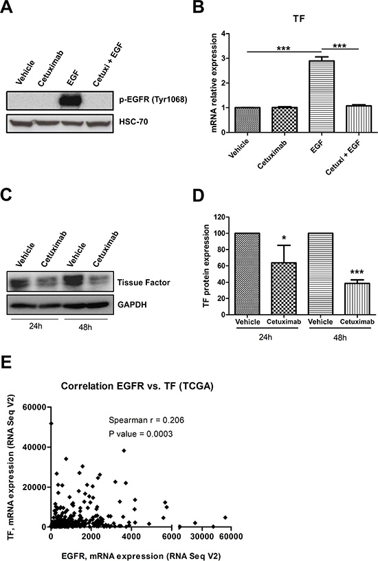 Recent studies have demonstrated that EGFR activation drives TF upregulation in tumor cells derived from glioblastoma and vulvar cancer [12, 35]. To directly test whether EGFR modulates TF expression in cervical cancer, we treated CASKI cells with cetuximab one hour before recombinant epidermal growth factor (EGF). As expected, treatment with EGF for 10 minutes increased EGFR phosphorylation at Tyr 1068, and cetuximab completely inhibited this effect (Figure 6A). EGF treatment for 90 minutes increased TF expression at mRNA level by 3-fold compared with that of the cells treated with vehicle (Figure 6B). Cetuximab entirely blocked EGF-induced TF upregulation (Figure 6B). As reported in Figure 1E, CASKI cells showed high TF expression levels under basal conditions. Interestingly, prolonged treatment of CASKI cells with cetuximab for 24 h or 48 h decreased TF expression, at protein level, by approximately 35% and 60% respectively (Figure 6C and 6D). Consistent with our in vitro results, we found a significant positive correlation between the mRNA expression levels of EGFR and TF in transcriptome data from cervical cancer patients deposited in The Cancer Genome Atlas - TCGA (Spearman’s r = 0.206, P = 0.0003) (Figure 6E). Therefore, our results suggest that EGFR upregulates TF expression in vitro and in malignant tissues derived from cervical cancer.