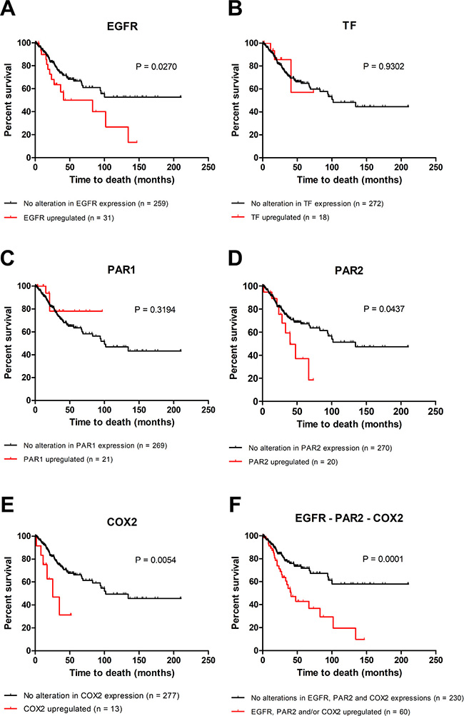 As shown in Figure 7, there were not significant correlations between the overall survival and gene expression alterations of TF (Figure 7B) and PAR1 (Figure 7C). On the other hand, upregulation of EGFR (P = 0.027, Figure 7A), PAR2 (P = 0.0437, Figure 7D) or COX2 (P = 0.0054, Figure 7E) showed independent prognostic value.