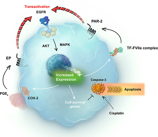 ATP7A: ATPase copper transporting alpha; ATP7B: ATPase copper transporting beta; BAX: Bcl-2-associated X protein; CDDP: cis-diamminedichloroplatinum; COX: cyclooxygenase; EGFR: epidermal growth factor receptor; ERCC1: excision repair cross-complementation group 1; ERK: extracellular signal-regulated kinase; FVIIa: activated factor VII; GAPDH: glyceraldehyde 3-phosphate dehydrogenase; GPCR: G protein-coupled receptor; HPV: human papillomavirus; HSC70: heat shock cognate protein 70; MAPK: mitogen-activated protein kinase; PAR: protease-activated receptor; PAR1-AP: PAR1-specific agonist peptide; PAR2-AP: PAR2-specific agonist peptide; PARP: poly (ADP-ribose) polymerase; PGE2: prostaglandin E2; PPP: platelet-poor plasma; TCGA: the cancer genome atlas; TF: tissue factor; TPM: transcripts per million; XIAP: X-linked inhibitor of apoptosis protein.