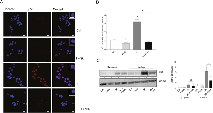 The tumor suppressor p53 has been implicated in regulation of autophagy, in particular related to cellular stress [17, 20]. It is generally believed that nuclear levels of p53 promote autophagy, whereas cytosolic levels prevent the autophagy process [20, 33]. Having previously established that cAMP-mediated inhibition of DNA damage-induced apoptosis of BCP-ALL cells involves down-regulation of p53 [24, 25], we here confirmed the ability of forskolin to reduce the level of IR-induced p53 commencing as early as 4 hours after IR (Supplementary Figure 4A). In order to assess whether the subcellular localization of p53 was affected by any of the treatments, we performed confocal microscopy of REH cells stained with an antibody directed against p53. As shown in Figure 7A, we found that IR enhanced both the nuclear and cytosolic levels of p53, whereas co-treatment with forskolin selectively reduced the levels of p53 in the nuclei. Forskolin alone had no effect on the nuclear localization of p53 (Figure 7A and 7B). To confirm these findings, we performed cellular fractionation experiments followed by immunostaining of p53. The data presented in Figure 7C confirm that forskolin selectively inhibits accumulation of p53 within the nuclei of irradiated REH cells.
