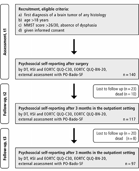 Informed consent was obtained after surgery by (MR, AKH and MNO). Each patient was screened three times for psychosocial burden, general health perception, health-related quality of life (HRQoL) and distress using the NCCN Distress Thermometer [9] (DT), the Hornheide Screening Instrument [37, 38] (HSI), the European Organization for Research and Treatment of Cancer Quality of Life Questionnaire with its brain cancer module (EORTC QLQ-C30 + EORTC QLQ-BN20 [39, 40]) and the Basic Documentation for Psycho- Oncology Short Form (PO-Bado SF [18]). The physicians (MR, MNO, AKH) using the PO-Bado SF were trained according to the manual. Further patients were asked if at all three time points if systematically they wished to receive psychosocial support because of their subjectively perceived burden regardless of their screening results.