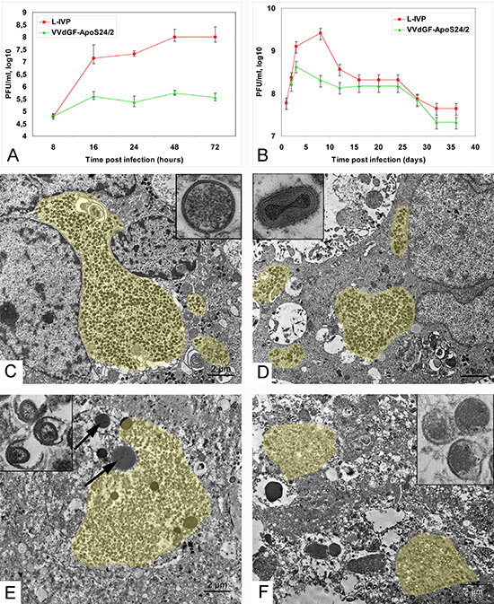 Figure 1: Vaccinia virus replication in carcinoma A431 cells. (A) Titers of the L-IVP and VVdGF-ApoS24/2 strains in the A431 cells during 72 h of in vitro incubation, and (B) in tissue of the carcinoma A431 xenografts in mice. Data are represented as a mean ± SD. (C) Active replication of the L-IVP strain and (D) apoptin-producing recombinant VVdGF-ApoS24/2 strain in cells of the carcinoma A431 xenografts, 2 days after virus injection. Boxes show C) immature and D) mature viral particles at large magnification. (E) Destruction of infected cells in xenografts on day 8 after injection of the L-IVP strain, and (F) VVdGF-ApoS24/2 strain. Arrows are pointed at lipid droplets. Boxes show damaged viral particles in cell “remains” in tumors on day 55 after the injection with E) L-IVP strain, and F) VVdGF-ApoS24/2 strain. Viral accumulations are painted with yellow color. Transmission electron microscopy, ultrathin sections.