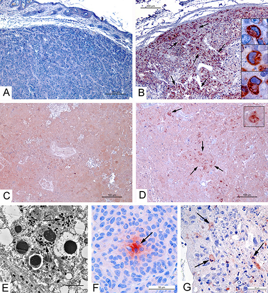 Figure 2: Apoptin production by VVdGF-ApoS24/2 strain and apoptosis in carcinoma A431 xenografts. Immunohistochemical staining of paraffin sections for apoptin-connected FLAG peptide in tumor peripheral zones on day 4 after injection of: (A) saline, negative reaction; (B) VVdGF-ApoS24/2 strain, positive reaction; and in tumor central zones on day 36 after injection of (C) L-IVP strain, negative reaction; (D) VVdGF-ApoS24/2 strain, positive reaction. Arrows show the sites of positive reaction, boxes show positively stained cells at high magnification. (E) Apoptosis of infected cell in the xenograft ultrathin section, day 2 after injection with VVdGF-ApoS24/2 strain. Arrows show virus particles. (F) Positive reaction for Apaf-1 protein (is shown by arrow) in the xenograft cells, day 4 after saline injection. (G) Caspase-3 positive cells (are shown by arrows) in xenograft, day 4 after injection with VVdGF-ApoS24/2 strain. Paraffin sections after processing with specific antibodies were treated with AEC chromogen, counterstained with hematoxylin.