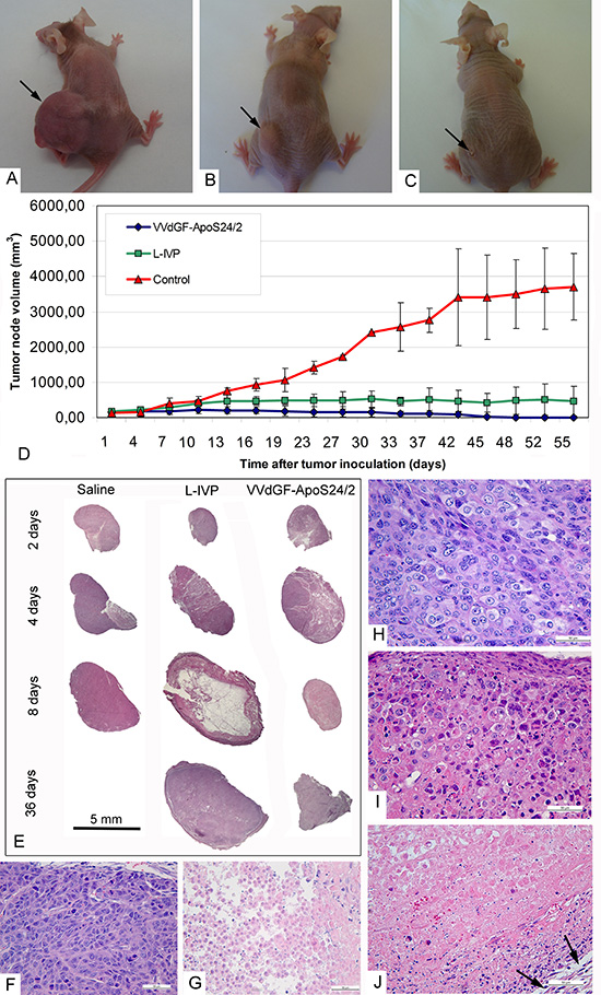 Figure 3: Regression and histological characteristics of A431 tumors in mice after single intratumoral injection of the VACV L-IVP or VVdGF-ApoS24/2 strains. Photographs of mice on day 45 after injection of: (A) saline (control), (B) L-IVP strain, and (C) VVdGF-ApoS24/2 strain. (D) Tumor growth kinetics after injection of the L-IVP and VVdGF-ApoS24/2 strains in comparison with saline-treated mice. Data are represented as a mean ± SD. (E) Representative paraffin sections of the A431 tumors at different times after single injection of saline, the L-IVP and VVdGF-ApoS24/2 strains. Note large cystic cavity in the tumor on day 8 after the L-IVP strain injection. (F) Peripheral zone and (G) central necrotic zone of the A431 tumors in mice, 2 days after the injection of saline (control group). Peripheral zones of the tumors in mice after: (H) 2 days; (I) 4 and (J) 8 days after the injection of VVdGF-ApoS24/2 strain. Swollen rounded cells were few on day 2 and increased in number on day 4 when some necrotic cells were also observed at the tumor periphery. The tumor tissue was completely destroyed on day 8 after injection, hematoxyline stained nuclei debris is seen in adjacent to capsule, which is shown by arrows. Paraffin sections, hematoxyline and eosin staining.