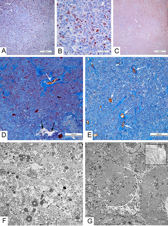 Figure 4: Morphological characteristics of carcinoma A431 xenografts in mice. (A-C) Immunohistochemical reaction for the Ki-67 protein. (A) High proliferative activity of tumor cells in xenograft injected with saline; (B) Positive reaction for the Ki-67 protein in nuclei of carcinoma A431 cells, 2 days after injection with the L-IVP strain; (C) Negative staining in tumor, indicating absence of proliferating cells on day 36 after injection with VVdGF-ApoS24/2 strain; paraffin sections, AEC chromogen, counterstaining with hematoxylin. (D-G) 36 days after injection of the viruses. (D, E) Paraffin sections, Picro-Mallory staining. (D) Cell debris in the tumor injected with the L-IVP strain, (E) unstructured material in tumor injected with VVdGF-ApoS24/2 strain. Both photos: blue staining indicates collagen fibers, black arrows show cavity and white arrows show blood vessels; brown clumps represent cell debris stained by hematoxiline. (F, G) Representative electron micrographs showing the same areas of tumors injected with L-IVP strain (F) and VVdGF-ApoS24/2 strain (G). Masses of cell debris are present on photo F, lipid droplets are shown by asterisks. Photo G shows cell “shades” separated with streaks of cell debris. The box shows filaments at large magnification.