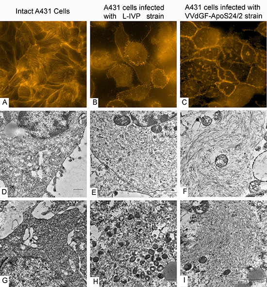 Figure 5: Disorganization of cytoskeleton in carcinoma A431 cells caused by VACV strains in vitro and in vivo. The upper row shows actin filaments visualized in fluorescent microscope with TRITC-falloidin in: (A) intact cell culture, (B) L-IVP strain infected cells, and (C) VVdGF-ApoS24/2 strain infected cells. The middle row shows the same cells visualized in electron microscope: (D) intact cell, (E) infected with the L-IVP strain, and (F) VVdGF-ApoS24/2 strain, clumps of actin are seen. Photos A-F were obtained from A431 cells in vitro, 48 h after the infection with VACV. The bottom row shows electron microscopic images of the A431 cells in vivo: (G) a cell of saline-treated tumor, (H) a tumor cell containing debris and viral particles, 36 days after injection of the L-IVP strain, (I) a tumor cell containing an accumulation of filaments, 36 days after the injection of the VVdGF-ApoS24/2 strain.