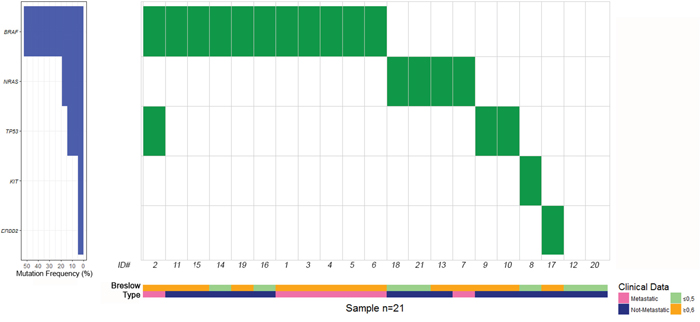 Table 2: Distribution of 21 metastatic and not-metastatic thin melanoma cases according to all gene mutations and specific mutated genes