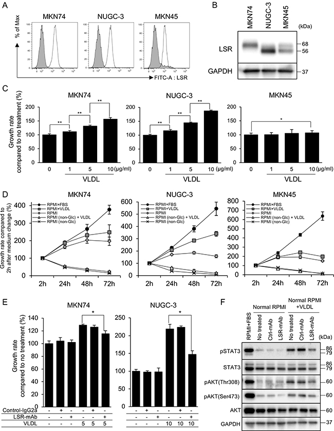 LSR binds to triglyceride-rich lipoproteins with increased affinity when activated by free fatty acids [13]. Therefore, we examined whether LSR is associated with GC cell proliferation. We first performed cell proliferation assays on GC cells exposed to VLDL in GC cells without FBS in order to clarify the change of cell proliferation by VLDL administration, and found that VLDL significantly promoted the proliferation of MKN74, NUGC-3, and AGS cells but not of MKN45 cells (Figure 3C, Supplementary Figure 1B). We next evaluated the effect of glucose and VLDL administration on GC cell growth. The 4 GC cell lines did not show cell proliferation in the absence of glucose, and no additional effect of VLDL administration was observed. With normal RPMI1640 (2000 mg/mL glucose), cell proliferation was observed after 24 and 48 h in all 4 GC cell lines, but decreased after 72 h. MKN74 and NUGC-3 cells with normal RPMI1640 (2000 mg/mL glucose) treated with VLDL exhibited increased proliferation in a time-dependent manner, while proliferation of MKN45 and AGS cells was not affected after 72 h (Figure 3D, Supplementary Figure 1C).