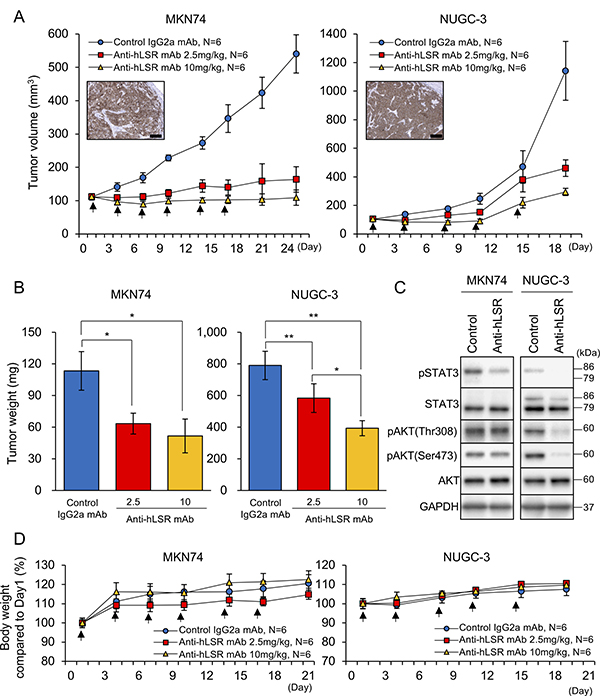 Figure 4: Antitumor effect of the anti-human lipolysis-stimulated lipoprotein receptor (LSR) monoclonal antibody (mAb) (#1–25) in gastric cancer (GC) xenograft mouse models (MKN74 and NUGC-3; female ICR nu/nu mice 6–8 weeks of age were injected with 5 × 106 GC cells). When tumor volumes reached approximately 100 mm3, control IgG2a mAb or anti-hLSR mAb (#1–25) was injected intraperitoneally. (A) Tumor volumes were measured twice per week. Immunohistochemical analysis of LSR in subcutaneous tumors of GC cell lines in xenograft mouse models are shown in the insets; scale bar = 100 μm. Values shown represent the means ± standard errors of the means. (B) Tumor volumes were calculated after the end of treatment and compared using Student’s t-tests (*P < 0.05, **P < 0.01). Values shown represent the means ± standard deviations (SDs). (C) Western blot analysis of p-STAT3/STAT3, pAKT(thr308), pAKT(ser473), and AKT in MKN74 and NUGC-3 cell-derived tissues from control IgG2a mAb or anti-hLSR mAb-injected animals. (D) Mice body weights were measured twice per week. Values shown represent the means ± SDs.