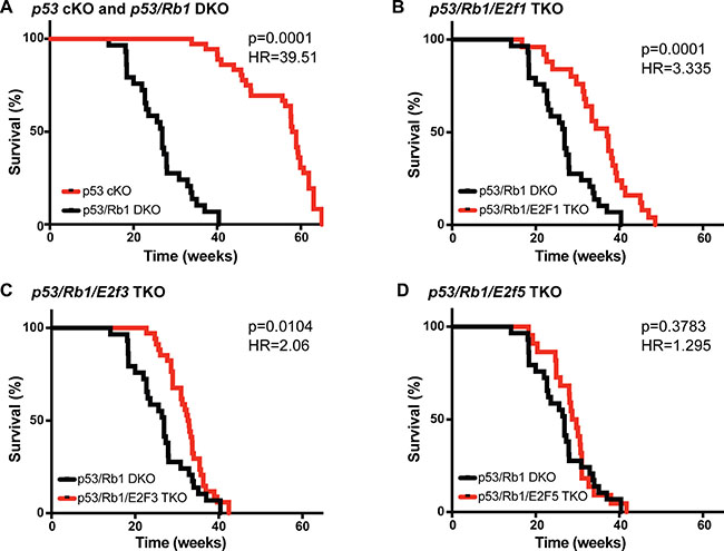 Figure 1: Loss of E2f1 or E2f3 increases survival in osteosarcomas bearing Rb1 mutations. (A–D) Kaplan–Meier curves showing the survival of osteosarcoma-prone mouse models. (A) Mice bearing Rb1 mutations p53/Rb1 DKO: Osx-cre; p53lox/lox; Rb1lox/lox (black, n = 29) have significantly shorter lifespan compared to p53 cKO: Osx-cre; Tp53lox/lox (red, n = 35). This survival time was significantly increased in (B) p53/Rb1/E2f1 TKO: Osx-cre; p53lox/lox; Rb1lox/lox; E2f1−/−(red, n = 25) and (C) p53/Rb1/E2f3 TKO: Osx-cre; p53lox/lox;Rb1lox/lox; E2f3lox/lox (red, n = 34); but not in (D) p53/Rb1/E2f5 TKO: Osx-cre; p53lox/lox;Rb1lox/lox;E2f5lox/lox (red, n = 22). Mantel-Cox test and Mantel-Haenszel hazard ratio (HR) were used for curve comparisons.