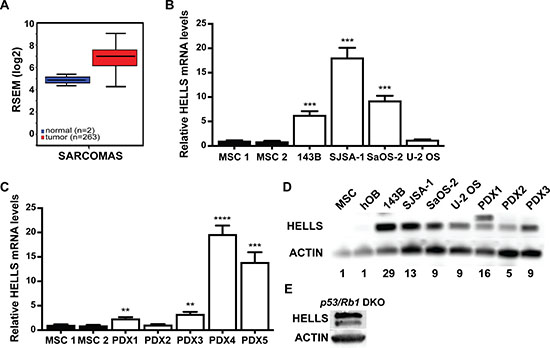 Figure 2: HELLS is overexpressed in human and mouse osteosarcoma. (A) The Cancer Genome Atlas data of RNA-Seq by Expectation-Maximation (RSEM) values from 263 human sarcoma samples (red) compared to normal control (blue) show a 4.27-fold increase in HELLS mRNA expression. (B–C) RT-qPCR analysis of HELLS mRNA expression in (B) 143B, SJSA-1, SaOS-2 and U-2 OS osteosarcoma cell lines and (C) patient-derived xenografts (PDX1-5), normalized to mesenchymal stem cells (MSC1 and MSC2) (D) Western blot detection of HELLS in osteosarcoma cell lines and PDXs show increased protein levels compared to two lineage progenitor controls, MSCs and human osteoblasts (hOB). Actin used as loading control. Band intensities were quantified by densitometry and normalized to MSC. (E) Western blot detection of HELLS in a mouse p53/Rb1 DKO tumor.