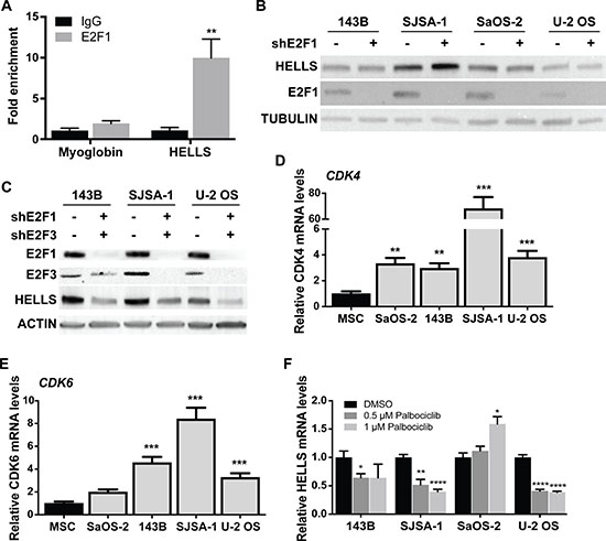Figure 3: HELLS is a direct transcriptional target of the RB-E2F pathway. (A) Chromatin immunoprecipitation (ChIP) assay reveals enrichment of E2F1 within HELLS promoter. Primers flanking the myoglobin promoter were used as negative control. Each point is mean ± s.d. of triplicate samples. (B–C) Western blot detection of HELLS protein level in osteosarcoma cells transduced with lentivirus containing shRNA against (B) E2F1 (shE2F1) show no significant change in HELLS expression, but (C) combination of E2F1 (shE2F1) and E2F3 (shE2F3) knockdown decreased HELLS protein levels. (D–E) RT-qPCR analysis of basal expression of (D) CDK4 and (E) CDK6 mRNA in different osteosarcoma cell lines normalized to mesenchymal stem cells (MSC). Each point is mean ± s.d. of triplicate samples. (F) RT-qPCR analysis of HELLS mRNA expression in osteosarcoma cell lines after Palbociclib-treated for 24 h, normalized to DMSO control cells. Each point is mean ± s.d. of triplicate samples. *p < 0.0332, ** p < 0.0021, ***p < 0.0002, ****p < 0.0001 by two-tailed t test.