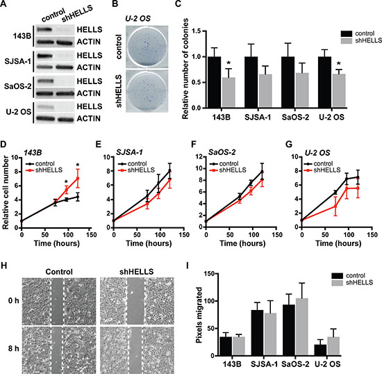Figure 4: HELLS knockdown does not affect in osteosarcoma cell proliferation and migration. (A) Western blot detection of HELLS protein level in osteosarcoma cells after transduction with shRNA against HELLS (shHELLS) compared to non-silencing controls (control) show effective decrease in HELLS protein. (B) Representative images from colony-forming wells with U-2OS cells transduced with shHELLS or non-silencing control. (C) Histogram of the proportion of number of colonies formed in osteosarcoma cells transduced with shHELLS or non-silencing control. Each bar is the mean ± s.d. of triplicate experiments. (D–G) Relative number of shHELLS and control cells over time measured by CellTiter-Glo Luminescence cell viability assay. Each data point is mean ± s.d. of four experiments. (H) Representative image for control (non-silencing control) and shHELLS in 143B cells. (I) Quantification of the distance (pixels) migrated for each of the osteosarcoma cell lines. Each data point is mean ± s.d. of ten measurements in triplicate samples. *p < 0.0332 by two-tailed t test.