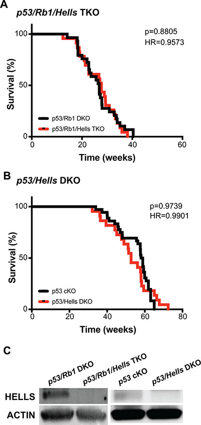 Figure 5: Hells has no effect on osteosarcoma tumorigenesis. (A–B) Kaplan–Meier curves showing the survival of osteosarcoma-prone mouse models. Loss of Hells in osteosarcoma-prone mice show no changes in overall survival in (A) Tp53/Rb1/Hells TKO: Osx-cre; Tp53lox/lox; Rb1lox/lox; Hells lox/lox (red; n = 23) compared to p53/Rb1 DKO: Osx-cre; Tp53lox/lox; Rb1lox/lox (black; n = 24) nor (B) p53/Hells DKO: Osx-cre; p53lox/lox; Hells lox/lox (red; n = 22) compared to p53 cKO: Osx-cre; p53lox/lox (black; n = 35). Mantel-Cox test and Mantel-Haenszel hazard ratio (HR) were used for curve comparisons. (C) Western blot detection of HELLS confirms loss of HELLS protein in p53/Rb1/Hells TKO mice and p53/Hells DKO mice and HELLS expression in p53/Rb1 DKO and p53 cKO osteosarcoma tumors.