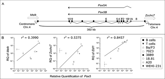 Figure 1: Expression of Pax5 isoforms is independent of the expression of neighboring genes. (A) Schematic organization of the genomic region of murine Pax5 gene. Pax5 is composed of 11 exons, the first two (exons 1A and 1B) being alternatively used to generate two isoforms (Pax5A and Pax5B respectively). Pax5 gene is flanked by Melk and Zcchc7 genes. (B) Correlation between Melk, Zcchc7 or Ebf1 expression and Pax5 expression. Quantitative PCR (QPCR) was performed at least as triplicate on Ba/F3, 70Z3, 38B9, 18.81, A20 and WEHI-231 cell lines and on B and T cells. Relative expressions (RQ) to Abl1 expression are expressed as mean with error bars representing RQMIN and RQMAX and constitute the acceptable error level for a 95% confidence interval according to Student’s t test. The square of the Pearson correlation (r2) is indicated for each comparison.