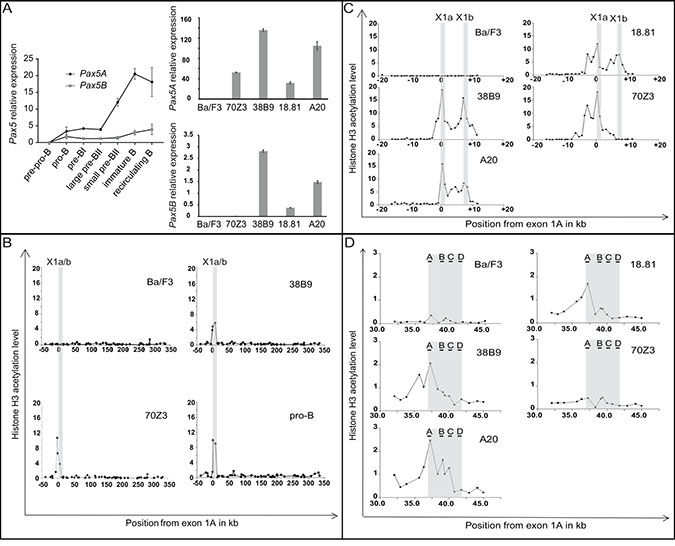 Figure 2: Correlation between Pax5 isoforms expression and chromatin acetylation of the Pax5 locus. (A) QPCR of Pax5A and Pax5B isoforms on B cells during differentiation and in various cell lines. Expression of Pax5 isoforms during medullar murine B cell differentiation was quantified on B cell subsets. Expression relative to Abl1 are presented as mean and standard deviation (left panel); Expression of Pax5A (upper right panel) or Pax5B (lower right panel) on Ba/F3,70Z3, 38B9, 18.81, A20 cell lines and pro-B cells from murine bone marrow are expressed relative to Gapdh expression as mean and standard deviation. (B–D) Chromatin Immunoprecipitation (ChIP) analysis of Pax5 locus on Ba/F3, 38B9, 70Z3 cell lines and murine pro-B sorted cells: QPCR was performed using primers covering the most conserved region (B) or located every 1 kb throughout promoter (C) or enhancer (D) regions. The increase over background was calculated by comparison with immunoprecipitates obtained using rabbit IgG antibody. Peaks of H3 acetylation are labeled according to their positions relative to the first nucleotide of Pax5 exon lA.