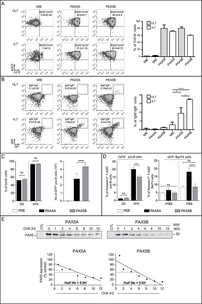 Figure 3: Both PAX5A and PAX5B can restore B cell differentiation program in complemented Pax5-/- pro-B cells. (A–B) Representative FACS analysis and statistics of differentiation of three independent infections of Pax5-/- pro-B cells. Cells were gated on FSC/SSC criteria, 7-AAD negative population (living cells) and eGFP-positive cells (infected cells) (not shown). Gated cells were analyzed for (A) the presence of B220 and Cd19 (the percentage of Cd19+ cells is indicated on the right panel graph) or (B) IgM and Igk membrane markers (the percentage of IgM+/Igk+ cells is indicated on the right panel graph) in two different conditions: with (+IL7, upper line) or without IL7 (-IL7, lower line) for three days. The first column show Pax5-/- cells infected with the eGFP-expressing vector (MIE), the second column with PAX5A retroviral construct and the third column with the PAX5B retroviral construct. The mean and the standard deviation of percentage of each population compared to the parental gate are indicated, *p < 0.05, **** p < 0.001. (C) Mean and standard deviation of percentage of Cd19+ cells (left panel); Absolute number of GFP+ Pax5-/- pro-B complemented with eGFP (MIE), PAX5A or PAX5B after 3 days of culture for three independent infections, ****p < 0.001 (right panel). (D) Percentage of 7-AADpos AnnexinVpos cells after 5 or 10 days in presence of IL7 (left panel) for three independent infections with PAX5A- or PAX5B-expressing vectors. ****p < 0.001. (E) Quantification of PAX5A and PAX5B proteins by Western-blot using an anti-Pax5 antibody after cycloheximide treatment for the indicated period of time on Ba/F3 infected cells demonstrating a similar half-life.