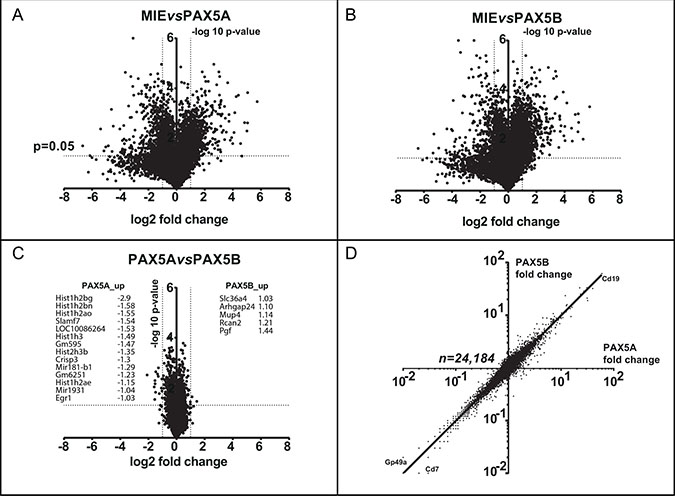 Figure 4: PAX5A and PAX5B drive a comparable transcriptomic early B cell program. (A–C) Volcano plots presenting the fold change in log2 on x axis and the log10 p-value of the false discovery rate permutation analysis on y axis of the transcriptome comparing eGFP expressing vector (MIE) to PAX5A (A), MIE to PAX5B (B) and PAX5A to PAX5B (C) showing the similar effect of PAX5A and PAX5B on early B cell differentiation restoration. For C, gene with a difference of expression >2 fold between PAX5A and PAX5B are listed. (D) Scatter graph with gene expression fold changes between PAX5A and MIE on x-axis and PAX5B and MIE on y-axis. The regression line shows the relationship between PAX5A and PAX5B impact on target gene expression. As example, Cd19 up-regulated gene and Gp49a and Cd7 down-regulated genes are indicated.