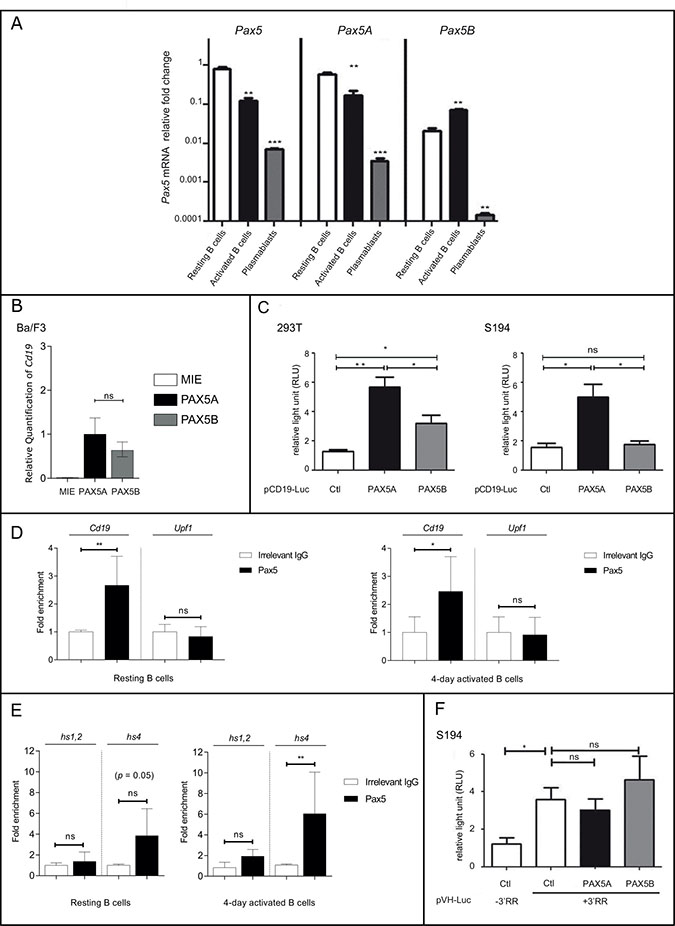 Figure 5: Pax5A and Pax5B show different activities during late B cell stages. (A) Expression by QPCR of total Pax5 or specific Pax5 isoforms in resting murine B cells, activated B cells and plasmablasts. Results are expressed as log scale with mean ± SEM of independent experiments. (B) Relative quantification of Cd19 transactivation in Ba/F3 after infection with either eGFP-expressing retrovirus (MIE) or MIE containing PAX5A or PAX5B (C) PAX5A or PAX5B trans-activity was determined using a Luciferase reporter (pCD19-Luc) assay in 293T cells (left panel) or S194 cells (right panel). Results are expressed as mean ± SEM of independent experiments. (D) ChIP was performed on Cd19 promoter (pCD19) and Upf1 intron 9 (as a PAX5 non-target) and using an irrelevant IgG or an anti-PAX5 antibody. Results are expressed as mean of fold change compared to IgG condition ± SEM of independent experiments. (E) ChIP was performed on the hypersensitive sites (hs)1,2 and hs4 elements of the 3ʹRR in resting splenic B cells or activated B cells (left and right panel respectively) using an irrelevant IgG or a anti-PAX5 antibody. Results are expressed as mean ± SEM of independent experiments. (F) A Luciferase expression B cell specific vector (pVH-luc) containing the IGH 3ʹRR minilocus (+3ʹRR) or not (–3ʹRR) was used in a reporter assay to determine the regulatory function of PAX5A and PAX5B in S194 cells. Results are expressed as mean of fold change compared to IgG condition ± SEM of independent experiments. Ctl: negative control, *p < 0.05; **p < 0.01; ***p < 0,001 (unpaired two-tailed t test).