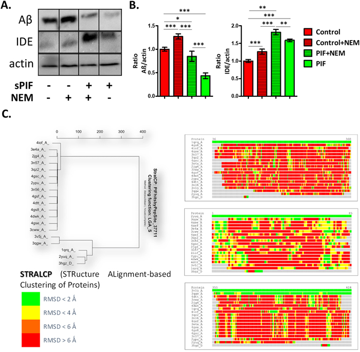 Figure 1: PIF reduces Aβ formation in IDE dependent manner and targets distinct protein families. (A) Representative Western Blots of Aβ and IDE in neuronal cells after APP transfection. (B) sPIF reduces Aβ formation in IDE dependent manner. (C) Identified regions of structural similarity within the set of protein structures by STRALCP. Clustering of structurally conserved fragments (left). STRALCP identified structural similarity between selected “reference” structure and other analyzed structures, represented as colored bars, based on Calpha - Calpha distance deviation at each position between the reference (top bar) and other structures (right). The colors indicate RMSD between aligned residues, ranging from green (below 2Å), yellow (below 4Å), orange (below 6Å), to red (above 6Å). STRALCP: STRucture ALignment-based Clustering of Proteins; RMSD: Room mean square distances; Aβ: Amyloid Beta; IDE: Insulin degrading enzyme; APP: Amyloid precursor protein; sPIF: synthetic PreImplantation Factor; * p<0.05; ** p<0.01; *** p<0.001 (ANOVA followed by two tail t test). In-vitro experiment results represent at least three independent experiments.