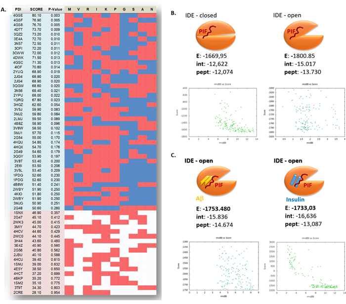 To further dissect the PIF-IDE interactions we retrieved molecular models corresponding to the 10 PIF targets obtained by experimental methods (ProteoArray and proteomics) and their homologous protein family members. Using Protein Data Bank (PDB) we extracted about 200 crystallography generated PDBs corresponding to the positive protein hits and more than 2500 crystallography generated PDBs corresponding to the negative protein hits and discarded the redundant ones to 60 and 2369 accordingly (see Supplementary Table 1). Using STRALCP (STRucture ALignment-based Clustering of Proteins) algorithm we identified multiple distinct protein families sharing a common structural “pattern” (Figure 1C). We determined the statistical probability of important residues resulting in the identification of M*RIKP**** amino sequence with the predicted small sequence (RIKP) likely to participate in peptide/protein interactions. PepSite had 95.24% true positive detection rate in PDBs corresponding to PIF positive targets identified using ProteoArray, while the PDBs corresponding to the negative targets available in the rest of the protein array had 40.33% false positive score (Figure 2A) [30]. Indeed, R3 and K5 seem to be most promising positive hits followed by the A9 and N10. Together, we identified the RIKP sequence as the most commonly participating in potential PIF-IDE interaction matching the R3*K5****N10 signature.