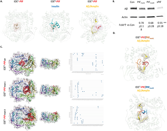 Figure 3: PIF competes with Insulin and Aβ for binding to IDE, but it binds to distinct sites. (A) Flexible peptidein silico docking of PIF to crystallography models of IDE in a complex with Insulin or with Aβ/Amylin, based on predicted binding site. Pink mesh shows PIF (in red) binding region. Blue represents Insulin and yellow Aβ or Amylin. (B) Representative Western Blots of Aβ in neuronal cells, after APP transfection, treated with sPIF and PIFmut1 and 3. (C) CABS Dock blind in silico docking of flexible PIF peptide (red) to IDE based on molecular dynamics. Binding interface is determined by interacting PIF AA residues with IDE, defined as PIF AA versus IDE AA. This is reflected as a shift of the putative binding interface (distance cutoff 4.5 Å) from deeper to more superficial AA residues in the PIF binding groove. This algorithm does not use PepSite2 predicted binding spots but rather scans IDE for binding affinity blindly. The docking/binding models visually confirm that the PIFmut1 is shifted out of the wild type binding pocket, while the PIFmut3 is completely removed from the pocket and rather binds by different set of IDE AA residues. (D) Flexible peptidein silico docking of PIF and PIFmut1 and 3 to crystallography models of IDEO in a complex with Aβ/Amylin, based on predicted binding site. Red (PIF), orange (PIFmut1), and blue (PIFmut3) meshes show binding regions in the presence of Aβ/Amylin (yellow).Aβ: Amyloid Beta; IDE: Insulin degrading enzyme; IDEC / O: Insulin degrading enzyme in closed or open confirmation; PIF: PreImplantation Factor; Con: Control. **p<0.01 (ANOVA followed by two tail t test). In-vitro experiment results represent at least three independent experiments. two-tailed Student’s t-test and results are presented mean + SD.
