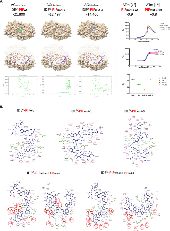 Finally, we determined to examine the structure-function relationship and exposed IDE in cell free environment (recombinant enzyme) to synthetic PIF. We used Differential Scanning Fluorimetry (DSF) to identify low-molecular-weight ligands that bind and stabilize purified proteins. Notably, we used a fluorescent dye-based probe that preferentially binds the hydrophobic regions of a protein, which are increasingly exposed during protein denaturation. Therefore, a ligand bound to a protein, e.g. to its active site, has the propensity to increase its thermal stability (and hence it’s Tm) through newly formed ligand-protein interactions allowing prospective binding ligand-affinity assessment [34]. We detected only PIFwt to bind effectively to the protein target (Figure 4A right panel) while the PIFmut1 showed reduced binding affinity and decreased ΔTm. In contrast, we detected minimally increased affinity of binding measured as positive ΔTmin PIFmut3. In order to determine the specific reason why the PIFmutants displayed reduced ΔTm or disrupted ΔGinterface, we generated planar schemes of PIF-IDE interface binding (Figure 4B). Interestingly, we detected loss of multiple hydrogen bonds and hydrophobic interactions in PIFmut1 compared to PIFwt.. Although PIFmut-3 lost as many hydrogen bonds as PIFmut-1, we detected increased hydrophobic interacting residues when “sliding out” of the natural groove (Figure 4A and 4B). PIFmutants predominantly bind closer to N-terminus amino acid residues of the IDEO chain. The PIFwt C-terminus binds Gly101 or Ser100 (Figure 4B). When mutated (loss of Pro6: PIFmut-1) PIF binding sites change such as Ala97 or Gly323. Together, this results in a shift in the binding site upwards of the groove. The loss of Ile4 (PIFmut-3) causes a similar shift in the IDE binding residues, but with increasing the probability of binding to Ala97, His65, or Pro171. Together, the predicted RIKP sequence and especially the specific I4 and P6 amino acid location are essential to for hydrophobic interactions with the IDEO complex.
