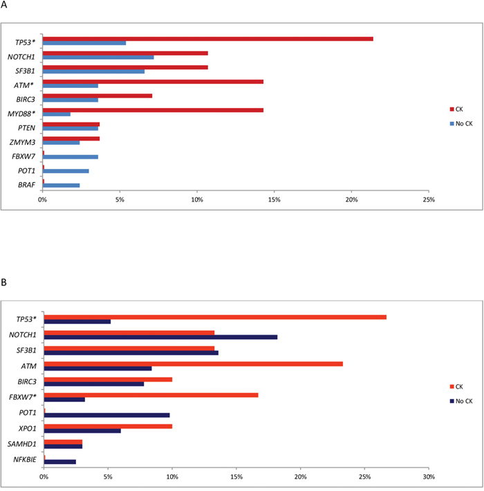 The U-IGHV status, del (17p)/TP53 mutations or del (11q)/ATM deletions were more frequently seen in CLL with CK, than in CL without CK (Figure 3) [22-24, 28-29, 39, 61-63].