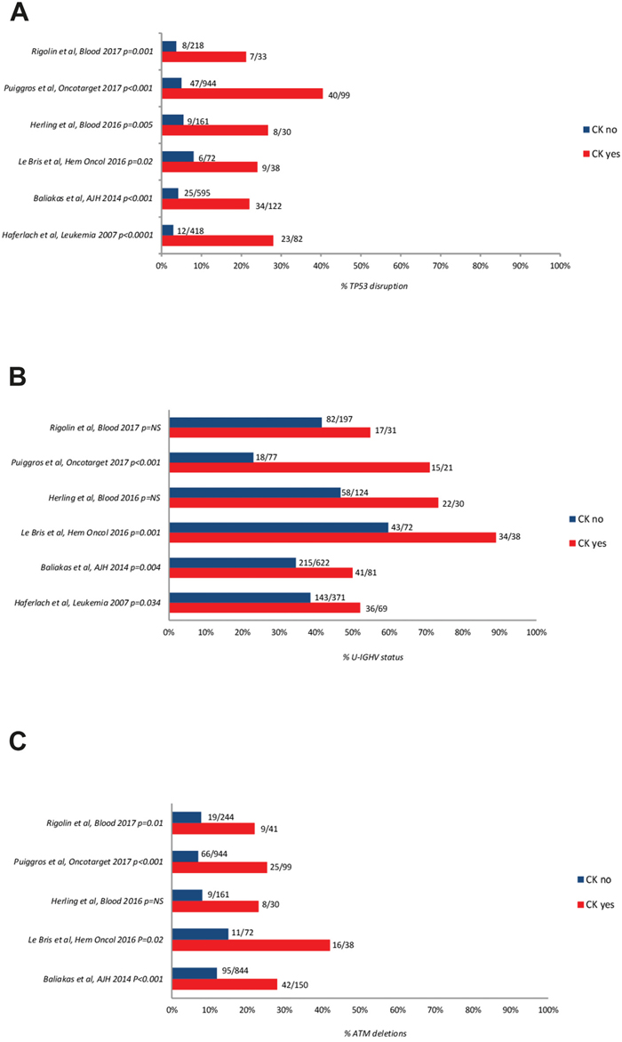 Figure 3: Frequency of TP53 disruption (A), ATM deletion (B), and unmutated IGHV gene configuration (C) according to the presence or absence of CK. The number of cases are reported aside each bar. NS: not significant; UM-IGHV: unmutated IGHV.