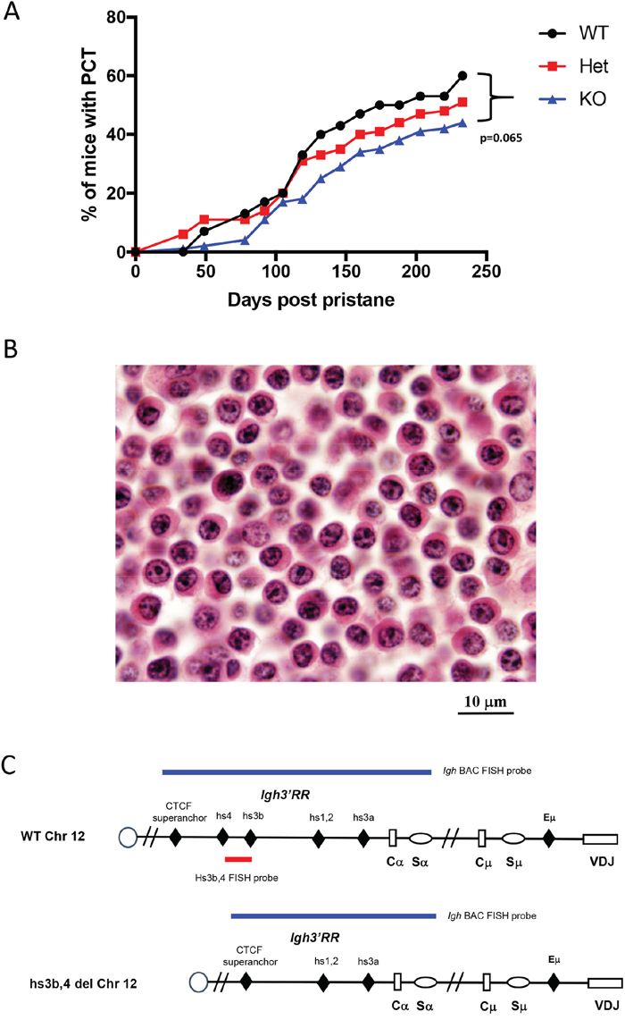 Figure 1: Deletion of hs3b-4 only moderately reduces PCT tumor incidence. (A) Incidence of PCT in hs3b-4+/+, hs3b-4+/- and hs3b-4-/- mice. The graph shows a lower tumor incidence in the hs3b-4-/- group and a haploinsufficiency phenotype in the hs3b-4+/- group. (B) Photomicrograph of oil granuloma showing advanced growth of a hs3b-4-/- PCT. The tumor has plasmablastic/plasmacytic appearance with abundant eosinophilic cytoplasm and a PCT-typical clock-face nuclear pattern (H&E, 100x oil). (C) Schematics of the WT and hs3b-4-deficient Igh locus. Colored horizontal bars depict location of FISH probes used to detect Igh translocations. 3’Igh BAC probe detects both WT and deleted alleles. hs3b-4 PCR-amplified probe detects only WT allele.
