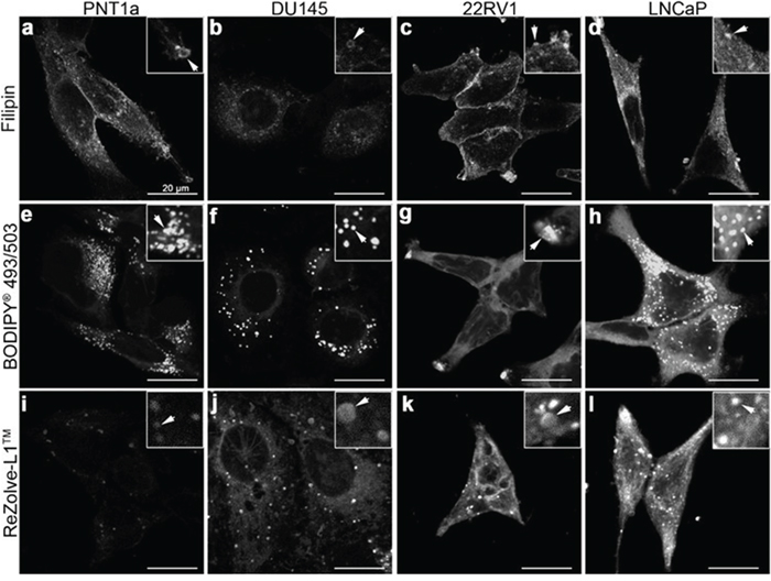 Figure 3: Distribution of lipids in prostate cancer cells. (a-l) Micrographs of cross-sections through prostate cells that show the intracellular location of neutral and polar lipids. Cholesterol was depicted by staining cells with Filipin III (a-d). Neutral lipids such as triglycerides and cholesteryl esters were detected by staining cells with BODIPY® 493/503 (e-h). ReZolve-L1™ (i-l) was used for staining polar lipids. Representative images from non-malignant PNT1a (a, e, i) and prostate cancer DU145 (b, f, j), 22RV1 (c, g, k) and LNCaP (d, h, l) cell lines. Prostate cells were fixed with 4% PFA (a-h) or imaged live (i-l). Scale bars, 20 μm.