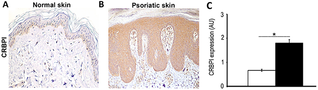 Figure 1: Expression of CRBPI in normal and psoriatic skin. (A) Representative image of the weak CRBPI immunoexpression, more in the basal layer of the normal skin epidermis; whereas (B) CRBPI expression strongly increases in psoriatic epidermis. (C) Bar graph shows the semiquantitative evaluation of epidermal CRBPI immunostaining. Results are expressed as mean values±SEM. *p<0.00001 at Student’s t-test.