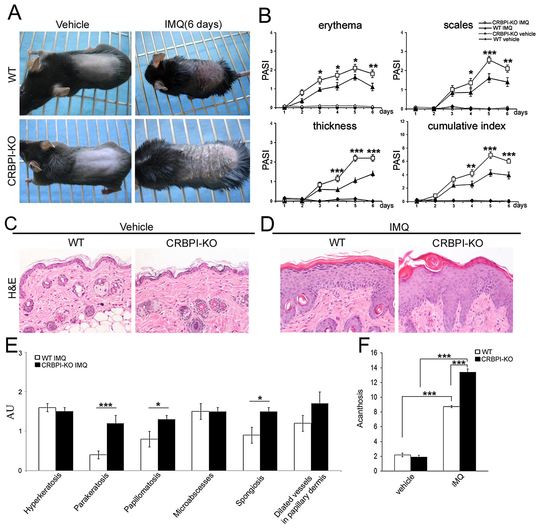 Figure 2: Imiquimod treatment induces more severe psoriasis-like lesions in CRBPI-knockout mice. (A) Back skin of wild-type (WT) and CRBPI-knockout (KO) mice after 6 days of treated control cream (vehicle) or imiquimod (IMQ); (B) daily scoring of erythema, scaling and thickness cumulative score (PASI) shows an early increase in imiquimod treated CRBPI-knockout skin compared to wild-type mice; (C-D) representative microscopic images of (C) vehicle control and (D) imiquimod-treated wild-type and CRBPI-knockout mouse skin, Haematoxylin&Eosin (H&E) staining; original magnification; 200X; (E-F) bar graphs showing semiquantitative evaluation of microscopic parameters of skin psoriasis in imiquimod-treated wild-type and CRBPI-knockout mice after six days. Results are expressed as mean values±SEM (n=8 mice per group); *p < 0.05; **p < 0.01;***p < 0.001 at Student’s t-test. Original magnification, 200X.