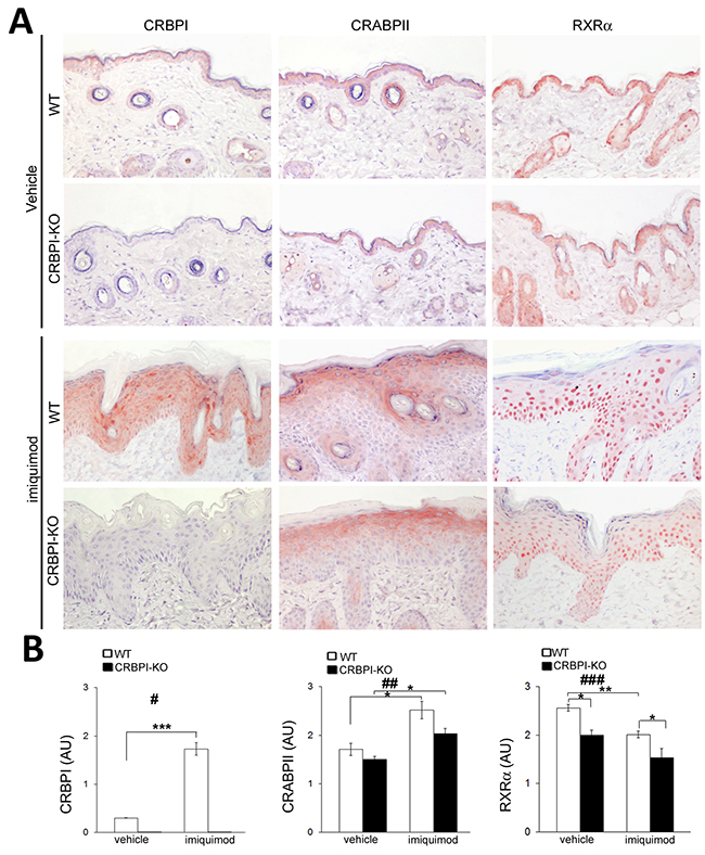 Figure 3: Evaluation of CRBPI, CRABPII and RXRα expression in imiquimod-induced psoriatic skin of CRBPI-knockout and wild-type mice. (A) Representative CRBPI, CRABP-II and RXRα immunostainings of wild-type (WT) and CRBPI-knockout (KO) mice skin after 6 days of treatment with control cream (vehicle) or imiquimod (IMQ). Original magnification 200X; (B) Bar graphs show the semiquantitative evaluation of CRBPI, CRABPII and RXRα immunostainings. Results are expressed as mean values±SEM (n=8 mice per group); ANOVA #p < 0.005, ##p < 0.0005, ###p < 0.000005. *p < 0.05; **p < 0.01;***p< 0.001 at Student’s t-test.