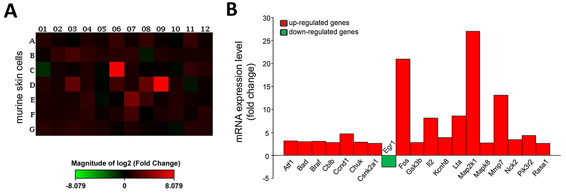 Figure 5: CRBPI deletion influences gene signaling in imiquimod-treated murine skin cells. (A) Heat map and (B) bar graph of RT2 profiler™ PCR assay of EGF/PDGF-related genes in isolated murine skin of imiquimod-treated wild type and CRBPI-knockout mice. Up-regulated and down-regulated genes reported in red and green, respectively.
