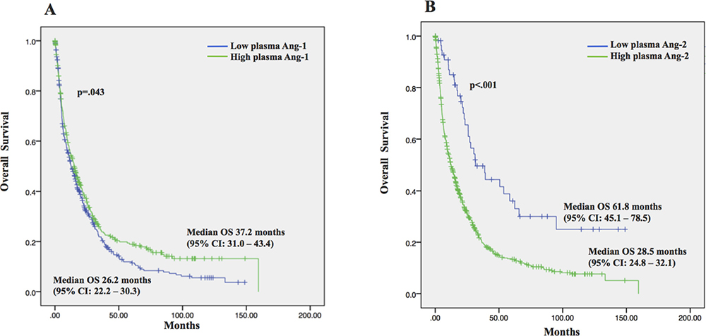 Ang-1 and Ang-2 plasma levels were measured in plasma samples with use of a commercially available multiplex immunoassay (Myriad, Human Discovery MAP, v3.3, Austin, TX, USA). All samples were collected prior to first cancer-directed treatment. There was no collection of samples after treatment, and no patient had a second measurement of circulation angiopoietin level at another time-point.