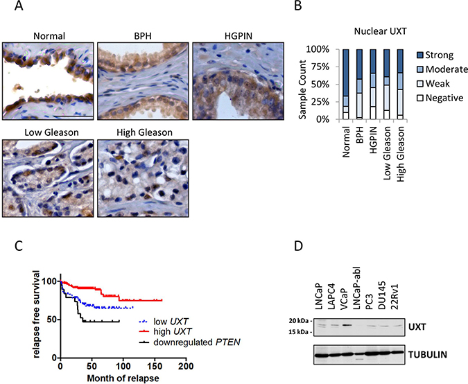 Analysis of a small clinical cohort suggested that loss of UXT expression in primary prostate cancer may be associated with tumor recurrence and poor prognosis [11]. Here we analyzed a large clinical cohort of prostate cancer to investigate UXT expression in disease progression. We then used prostate-specific UxtKO transgenic mice and prostate cancer cell culture models to investigate UXT function in CaP development and progression.