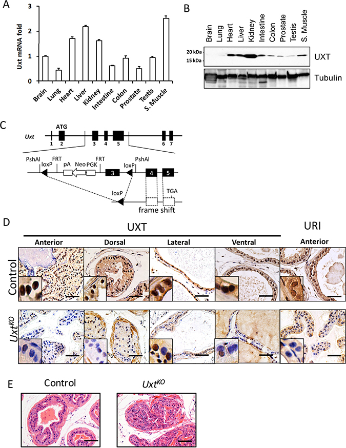 Figure 2: Uxt ablation in the mouse prostate resulted in PIN. Different mouse organs were harvested for RNA and protein. (A) Uxt mRNA expression was quantified by qRT-PCR (B) UXT protein expression in mouse organs by western blots. Tubulin is included as a loading control. (C) Schematic shows the genetic design of Pb-Cre induced Uxt KO in mouse prostate. (D) IHC with UXT specific antibodies confirmed loss of UXT and URI protein expression in UxtKO mouse prostate. (E) H&E staining shows a PIN phenotype in UxtKO mouse compared to control mice. Scale bar = 100 μm.