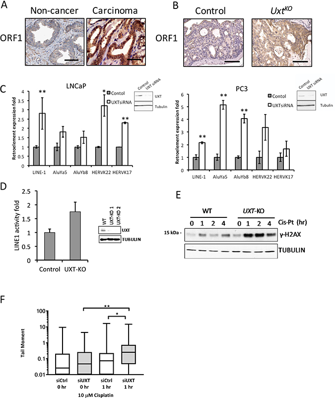 Figure 4: Loss of UXT in prostate promoted LINE-1 retroelement expression and retrotransposition. (A) IHC analysis shows ORF1 staining in human normal prostate (n = 5) and prostate cancer (n = 5). (B) IHC analysis shows ORF1 expression in control and UxtKO mice. Scale bar = 100 μm (C) siRNA-mediated UXT knockdown in human prostate cancer cells induced mRNA expression of Alu, HERVK and LINE-1 retroelements. RNA was harvested from control and siUXT LNCaP and PC3 cells. Retroelement expression was quantified by qRT-PCR. Inset panels show loss of UXT protein in UXT-KO cells. *p < 0.05, **p < 0.01 (D) Retrotransposition assays show that TALEN-mediated UXT-KO induced retrotransposition in C4-2 cells (p = 9 × 10-4). Inset shows dramatically decreased UXT protein expression levels. (E) UXT-KO in prostate cancer cells increased DNA damage accumulation and sensitized cells to cisplatin. Control and UXT-KO C4-2 cells were treated with cisplatin (10 μM) before cell lysates were harvested for western blot. Unrepaired DNA double strand breaks were measured by phospho-γH2AX by western blots. (F) Loss of UXT increases the tail moment in response to cisplatin. C4-2 control (siCtrl) and UXT knockdown (siUXT) cells were treated with cisplatin (10 μM) for 1 hour. The median (line), 25th-75th percentiles (boxes), and minimum and maximum values (whiskers) are shown; *p = 0.0106 and **p = 0.0054.